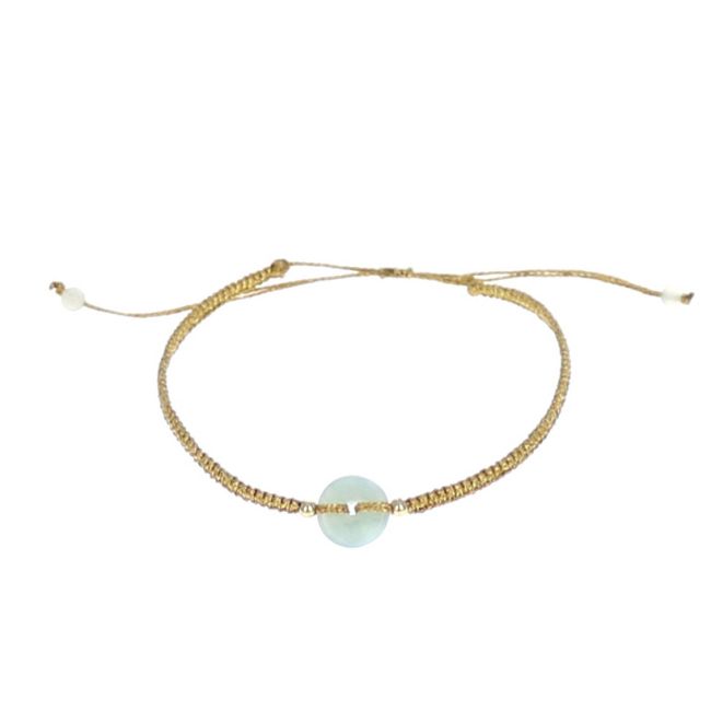 Ce bracelet est ajustable à l'aide d'un noeud coulissant au dos. La perle en cristal apporte un petit côté chic. Le fil est doré, tressé au bout avec ses deux perles, il ne gratte pas pas la peau.